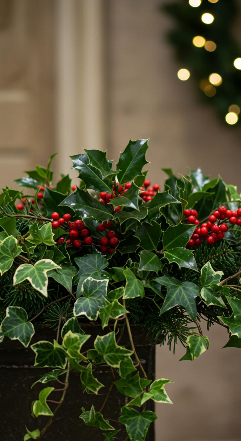 Choose vibrant holly varieties, like the glossy-leaved English holly, and intertwine them with lush ivy.