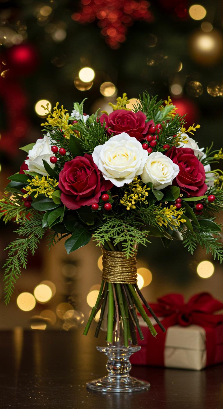 Embrace winter elegance by mixing crisp white roses, delicate silver accents, and shimmering foliage. This festive simplicity creates a tranquil atmosphere, inviting guests to bask in the beauty of the holidays.