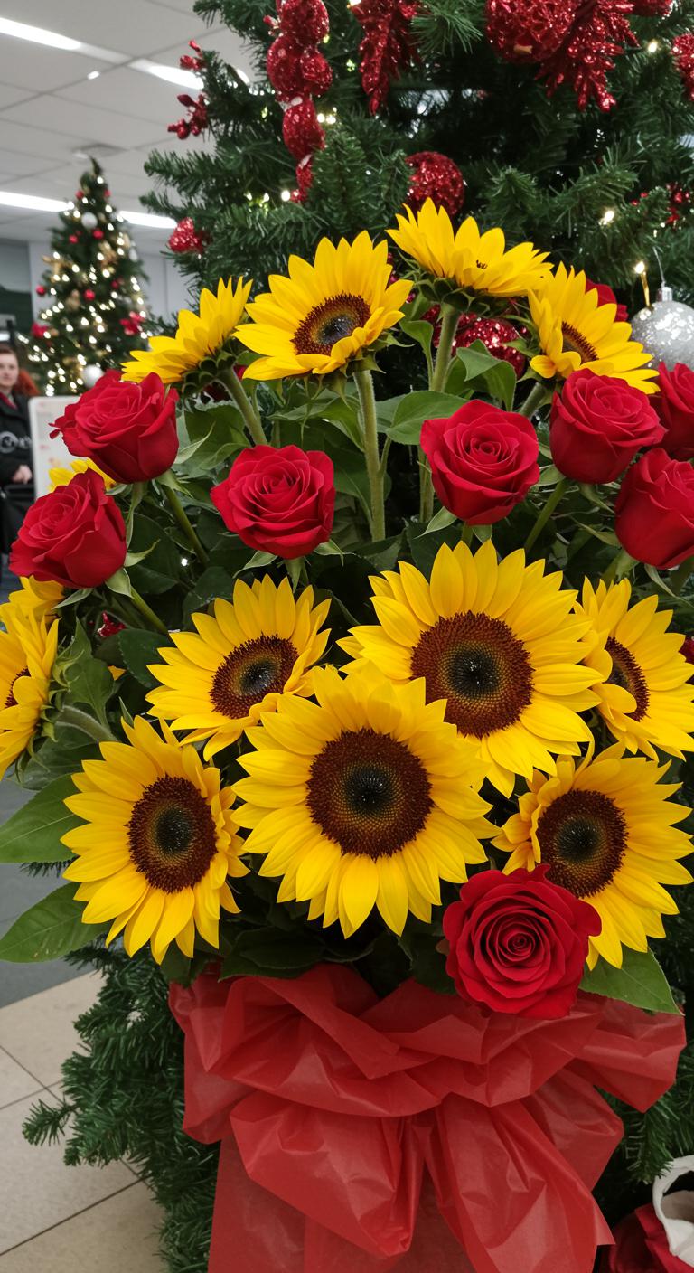 While the holidays often lean towards traditional reds and greens, a cheerful display of sunflowers and red roses brings a vibrant twist to your seasonal decor.