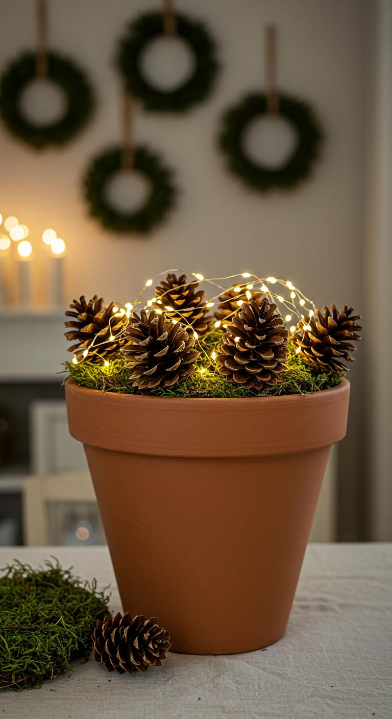 You’ll tuck pine cone crafts into a wide terra-cotta pot, add sand or moss for stability, then weave battery-powered strings.