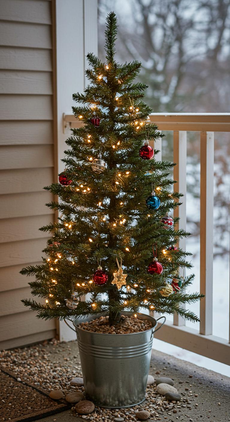 If you’d like a compact focal point, tuck a small Christmas tree into a decorative metal or wooden bucket to create instant porch charm; it’s easy to style, moves when you need it, and withstands winter weather better than fragile pots.