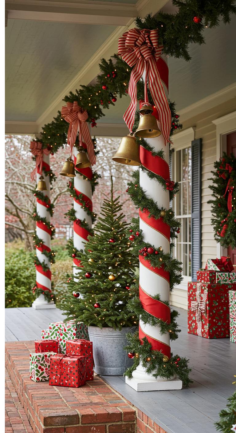 After you tuck your tree into its bucket, make the porch columns pop by wrapping them in wide ribbon and looping bells where the bands meet.