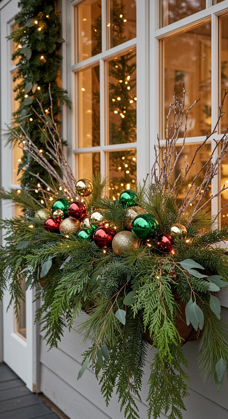 While you’re decking the porch, make your window boxes sing by filling them with a mix of evergreen boughs, textured branches, and shiny ornaments that catch afternoon light. You’ll choose ornament color schemes to echo your door or contrast boldly. Mix cedar, pine, and eucalyptus for versatile greenery combinations. Secure with floral foam, tuck lights between stems, and enjoy a carefree, tailored look.