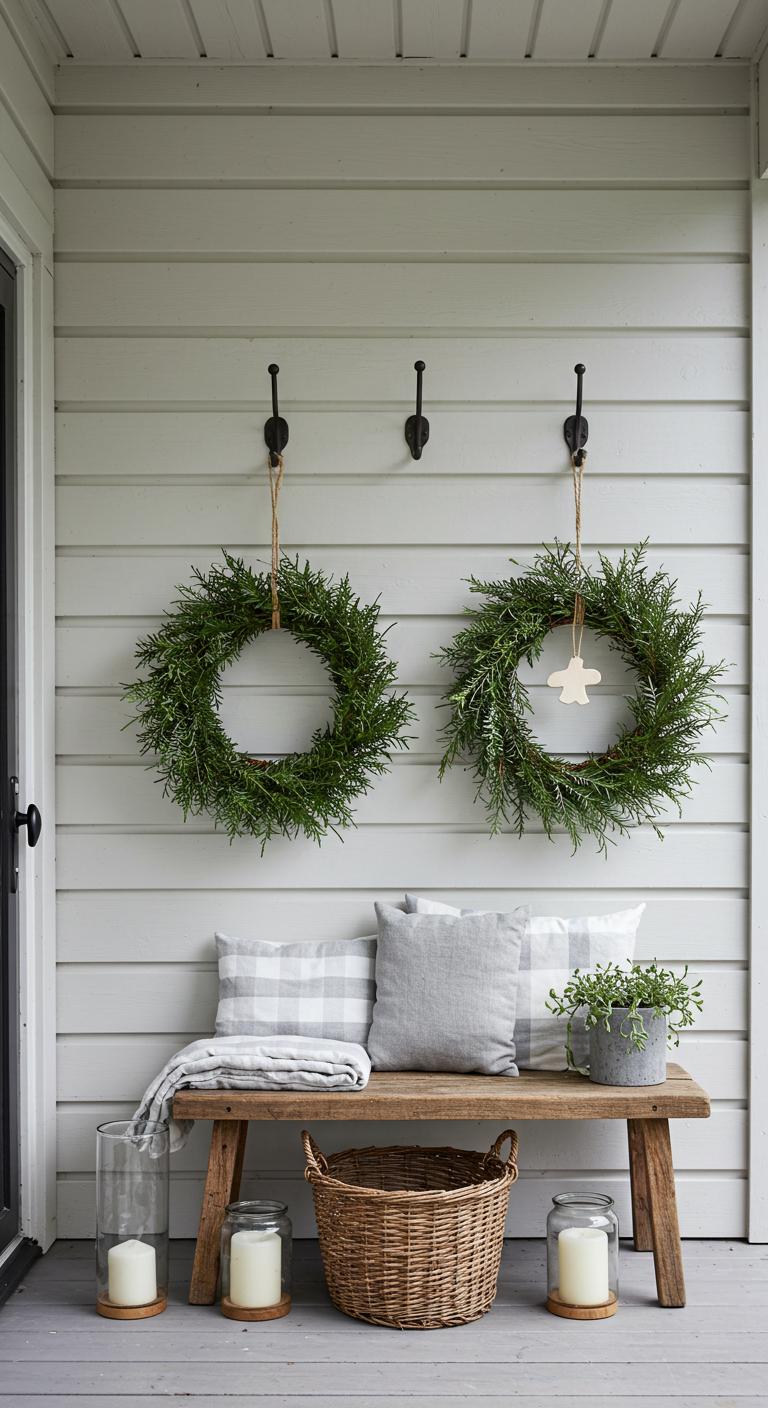Scandi wreaths on matching hooks create calm symmetry, save space, and let fresh scents and light textures define your porch without clutter—easy, freeing, striking.