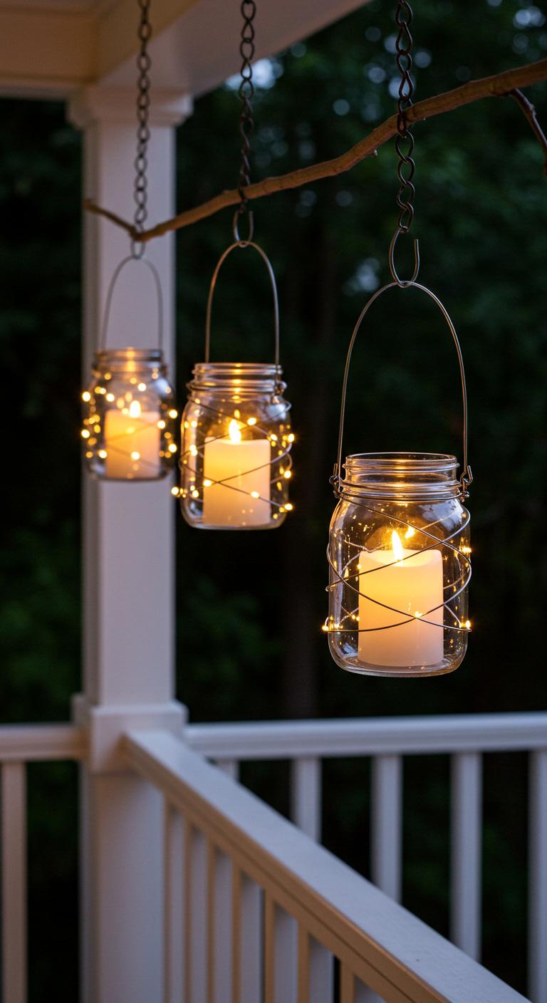 One or two mason jars hung at varying heights turn a plain porch into a flickering, cozy nook; you’ll wrap wire around the jar necks, nestle a candle inside (real or LED), and suspend them from hooks or a sturdy branch.