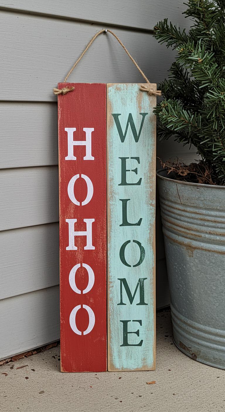When you want a big impact in a small space, a compact wooden pallet sign delivers: pick a slim pallet, sand and seal, then try pallet painting in layered washes for texture. Use holiday stencils for crisp messages—HO HO or WELCOME—and distress edges for character. Hang with twine or lean against a planter. You’ll get bold, portable cheer that fits any tiny porch.