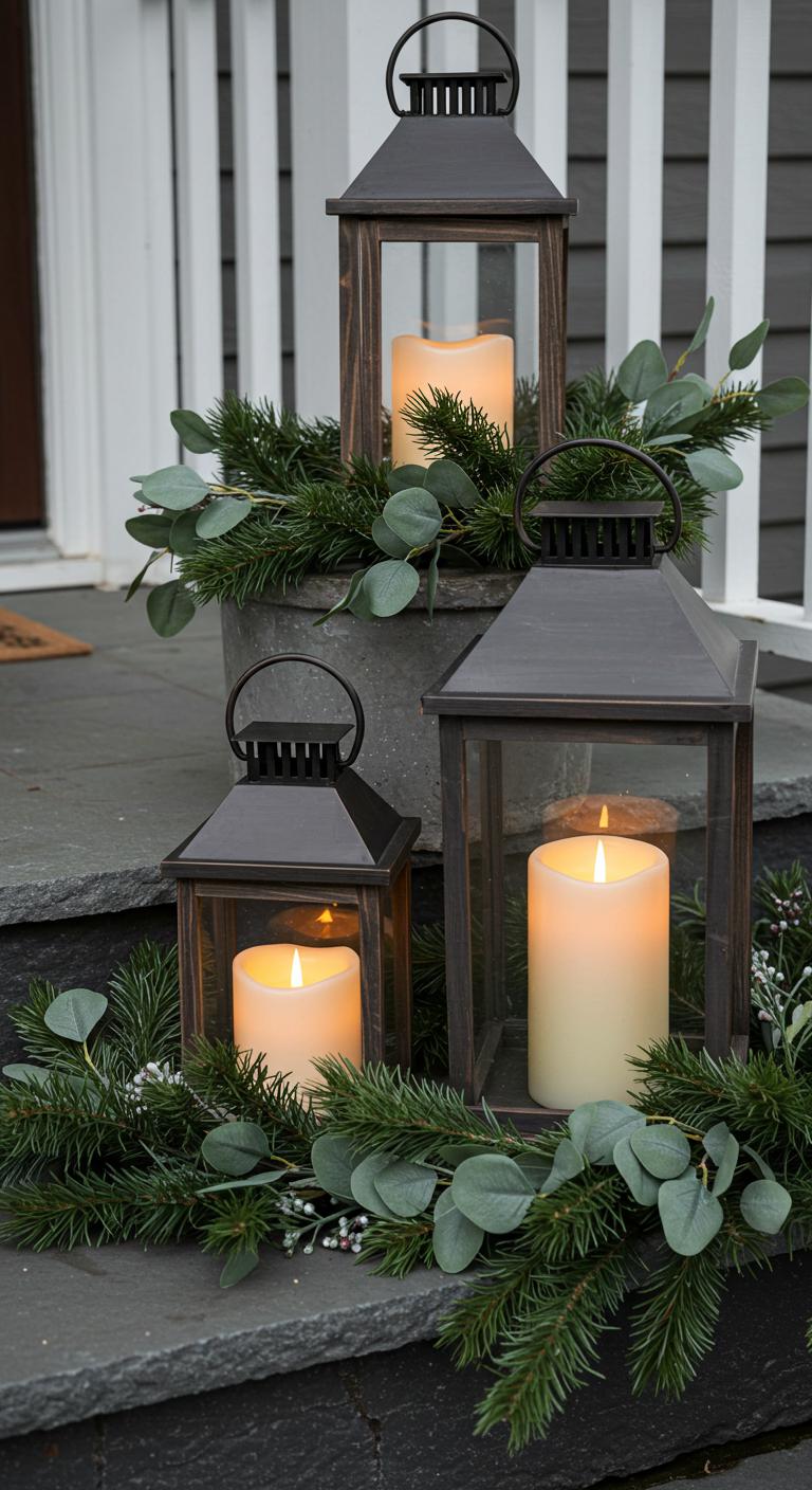 Cluster three lanterns of varying heights on your porch step or table, then tuck eucalyptus stems and pine sprigs around their bases for instant texture and fragrance.