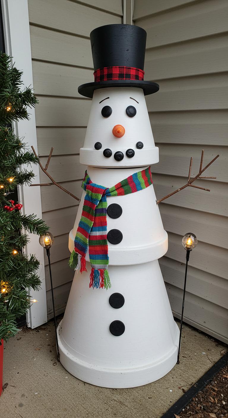 If you’re short on space but still want whimsical curb appeal, stack a few graduated planters to create a compact snowman that’s weatherproof and portable.