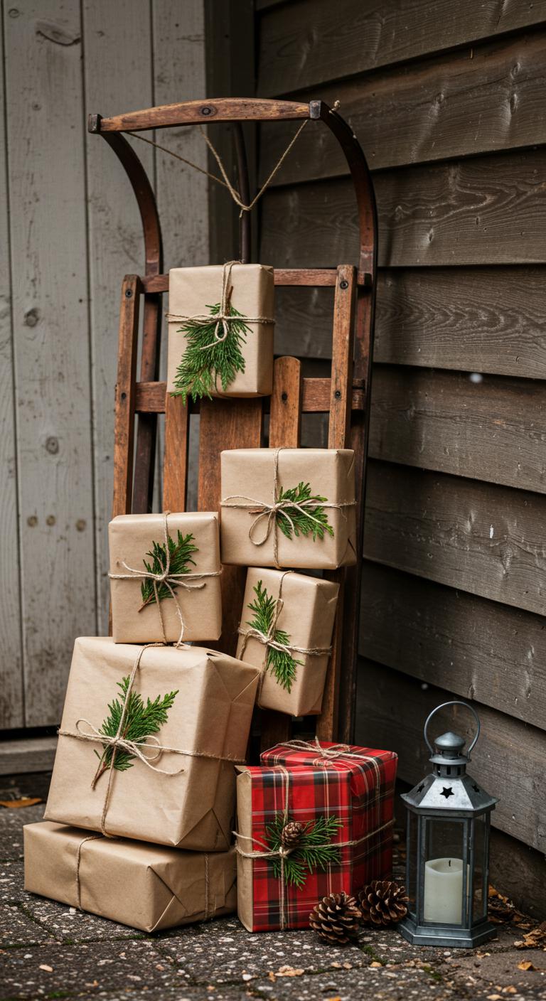 You’ll position the sled decoration where it won’t block traffic, mix kraft paper and plaid for rugged gift presentation, and add a simple pinecone or lantern to finish a liberated, handcrafted look.