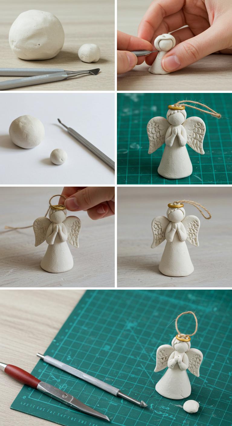Grab a small ball of air-dry clay and you’ll be surprised how quickly a simple angel takes shape—press a flattened oval for the body, roll a tiny ball for the head, and attach a thin teardrop for wings. You can personalize with simple tools, carve flowing robes, and experiment with angel ornament designs using basic air dry techniques. Seal, add twine, and hang proudly.