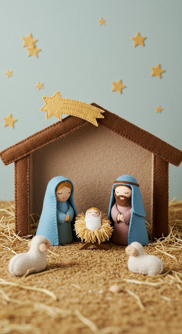 If you loved pressing leaves into clay for a nature-inspired ornament, you’ll also enjoy crafting a cozy felt nativity stable that brings the scene of the season into soft, hand-sewn form.