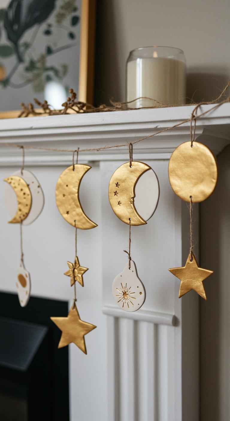 Create a simple clay moon and stars garland that fills your mantel or doorway with soft, handmade light—no sculpting experience needed. You’ll roll small crescents and circles, stamp subtle moon phases, and cut varied star patterns. Paint in muted golds and creams, string on twine, and space pieces freely. Hang low or drape high to celebrate quiet nights and creative independence.