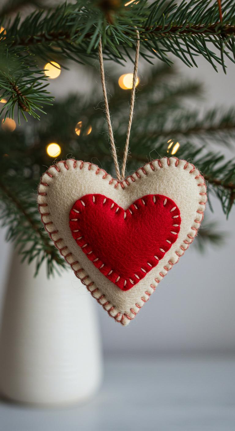 You’ll cut mirrored heart halves from contrasting Felt colors, hand-sew a visible running stitch, add a loop, and stuff lightly.