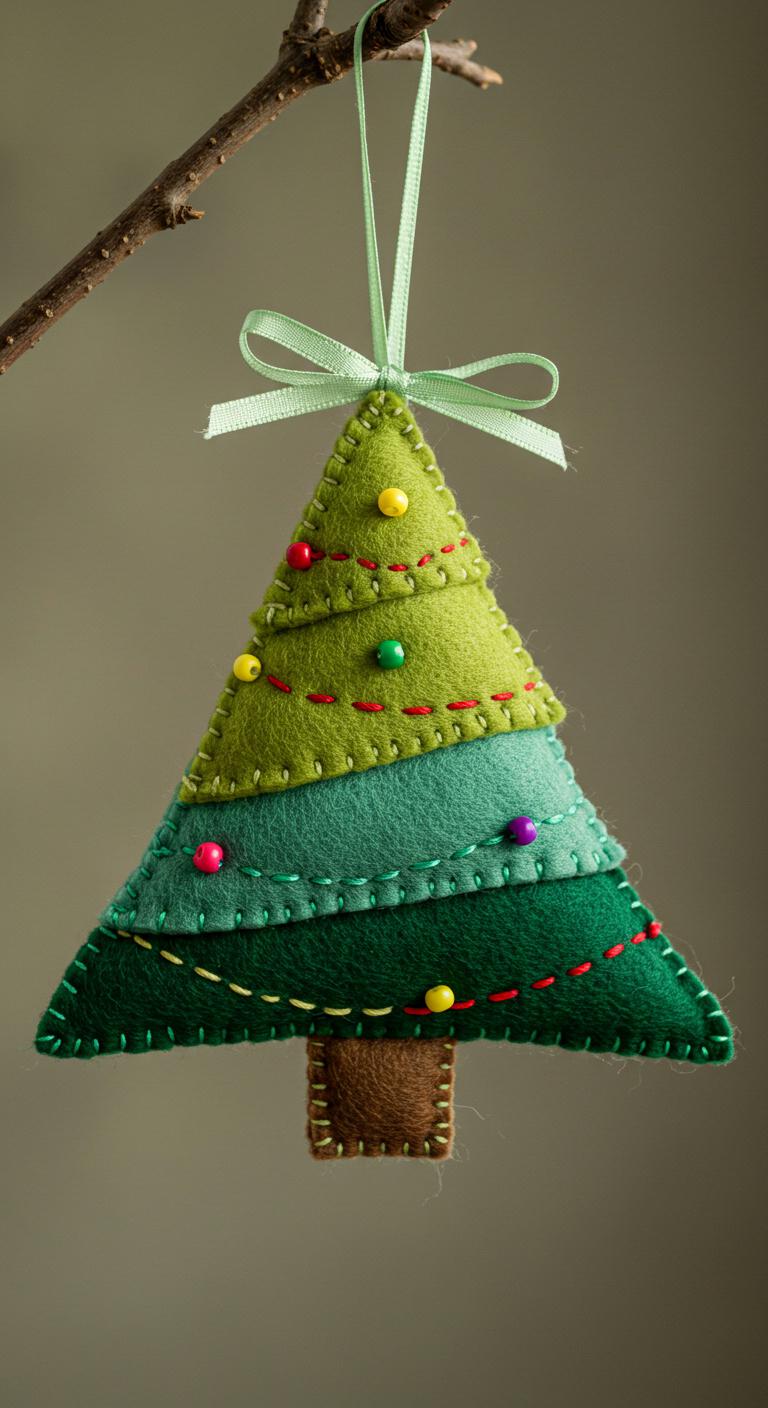 For a cozy, tactile ornament that’s easy to customize, try a layered felt Christmas tree you can stitch or glue together in minutes. You’ll cut graduated triangles, stack with layered felt techniques, and secure with simple running stitches or hot glue. Add beads, tiny pom-poms, or ribbon to make bold felt tree decorations. Hang it from a branch or gift tag—your choice.