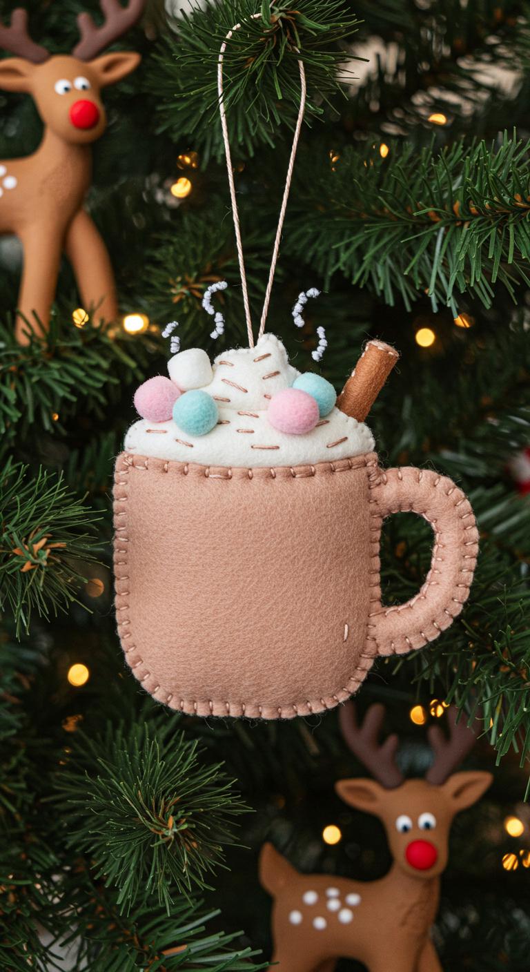 If your tree is already jingling with clay reindeer, add a cozy felt hot cocoa mug to bring warmth and whimsy to the branches.