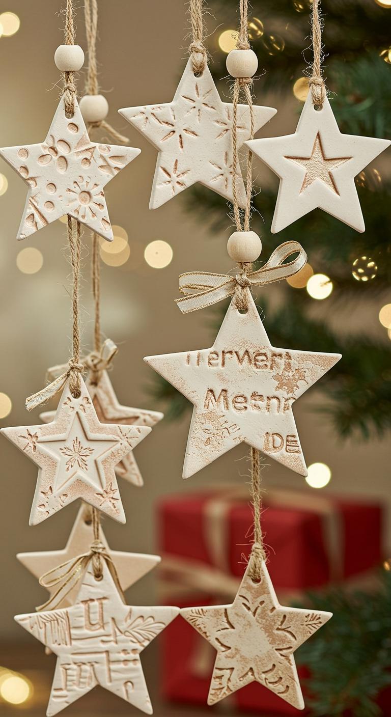 Start by rolling out air-dry clay to an even thickness and cut star shapes—your fingers will shape the character of each piece as you press patterns, stamps, or found textures into the surface.