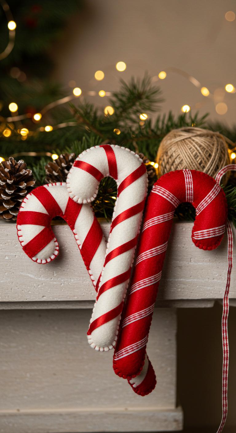 Although simple to make, a felt candy cane trio adds instant charm and a homemade touch to your tree, mantel, or gift tags. You’ll cut three striped shapes from red and white felt, stuff them lightly, and whipstitch edges for a clean finish. Hang them with thin twine or ribbon to create playful, portable festive decor that lets you personalize color, size, and placement.