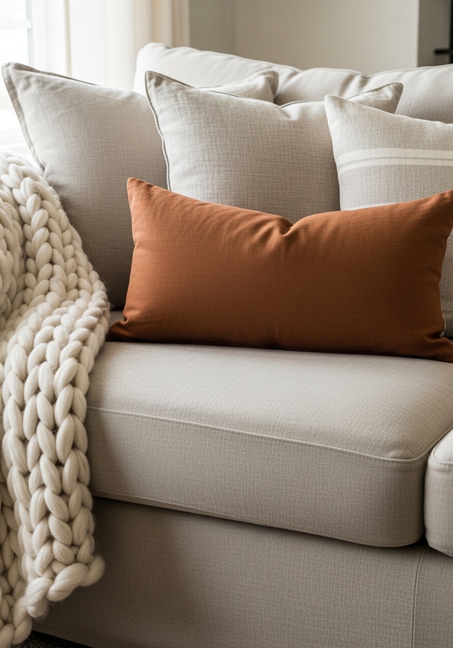 I used linen curtains and neutral pillows, then added a single rust pillow as my accent. The room feels warm because textures do the heavy lifting: linen, velvet, chunky knit. I paired velvet pillow covers with a chunky knit throw. Styling tip: follow a 2:1 texture ratio (two soft fabrics to every rougher one). Mistake to avoid: too many competing accent colors — keep one bold tone.