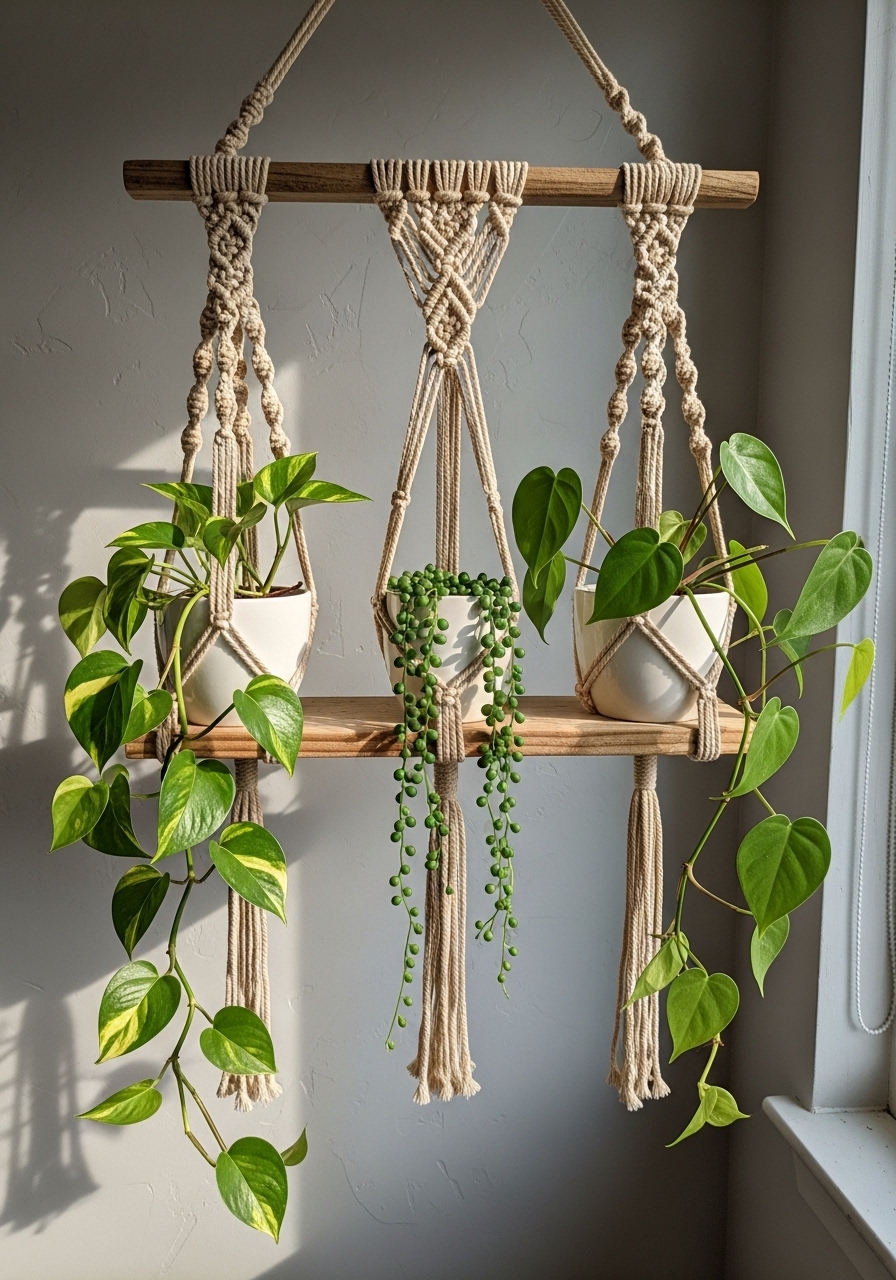 I hung a macramé plant hanger and added trailing greenery. Grouping plants at varied heights creates a cozy vertical vignette. Mistake to avoid: odd spacing — group in threes for balance.