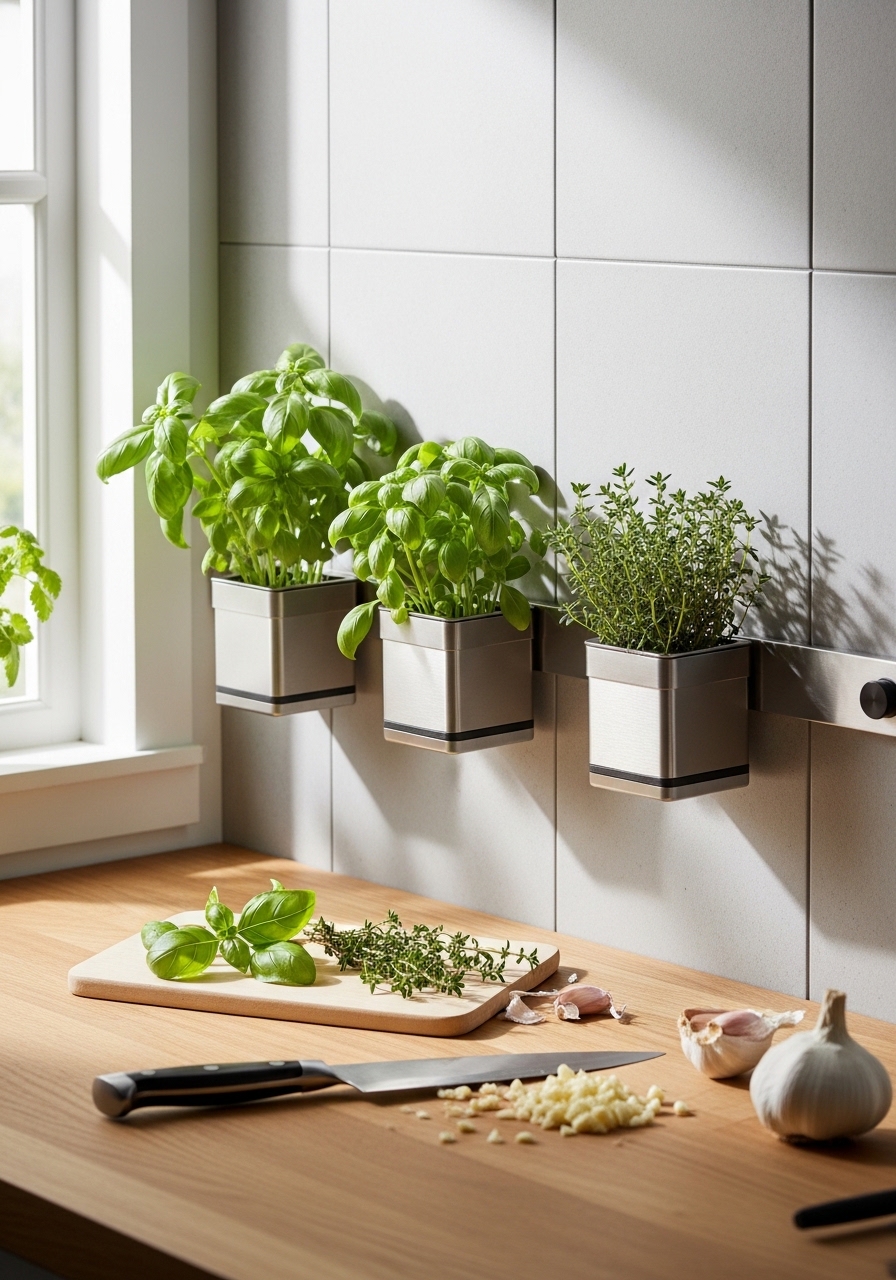 I added magnetic planters to a slim metal strip and mounted it near my stove. It’s pretty and useful—fresh herbs at arm’s reach. I used small magnetic planters. Mistake to avoid: placing too far from light — herbs need sun.