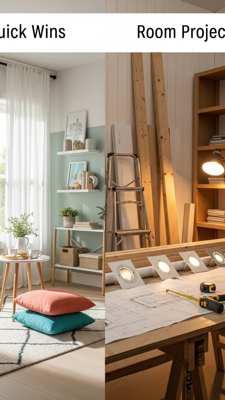 While you skim the list, think in two lanes: quick wins that refresh a space in an afternoon, and room projects that need planning, materials, and time. You’ll spot Quick Wins first — low-cost swaps, paint accents, styling tricks. Room Projects are larger: structural tweaks, built-ins, lighting reroutes. Choose by time, budget, and how much creative freedom you want.