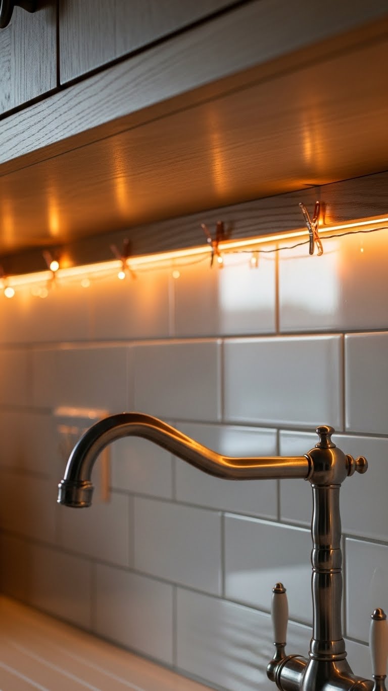 Brighten up the sink area with a copper string-light run that wraps neatly along the backsplash and under the cabinets, giving you warm, reflective highlights and a custom, high-end look for very little cost.