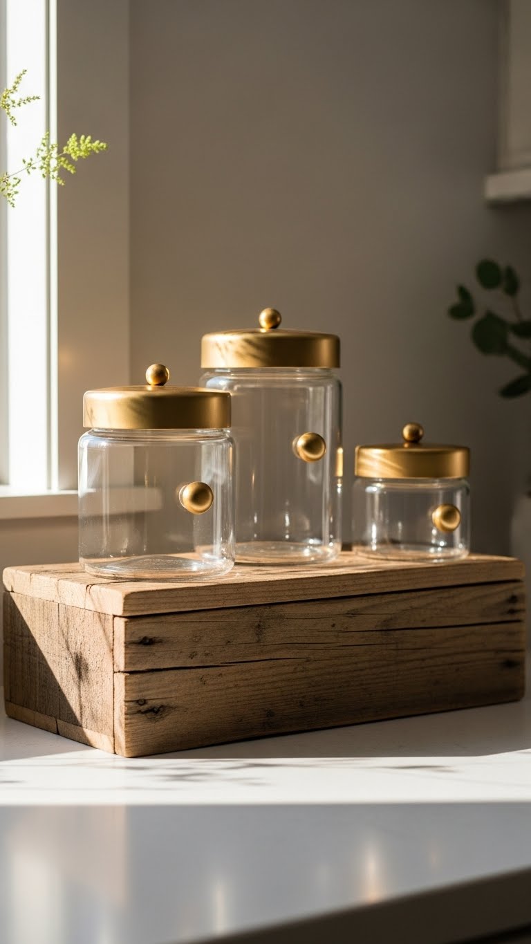 After you’ve finished the riser, use the extra countertop space to showcase matching, elevated storage jars that add instant polish. Swap plain lids for spray-painted gold lids, seal with matte lacquer for a soft, luxe finish, and screw on gold knobs for designer flair.