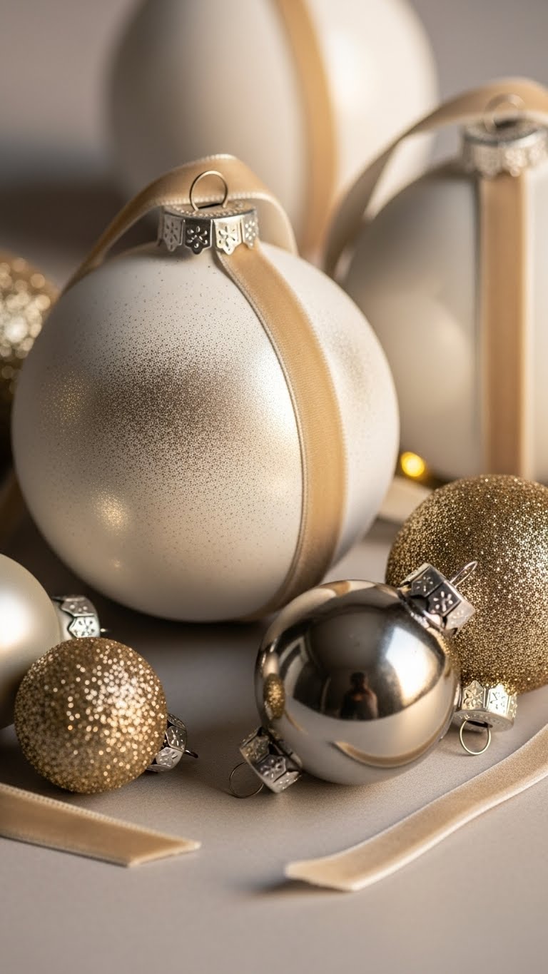 Glue on glittered baubles accents, trim with velvet ribbon for contrast, and cluster varied sizes for impact. Seal with clear coat. You’ll create chic, repeatable ornaments that feel indulgent without breaking free.
