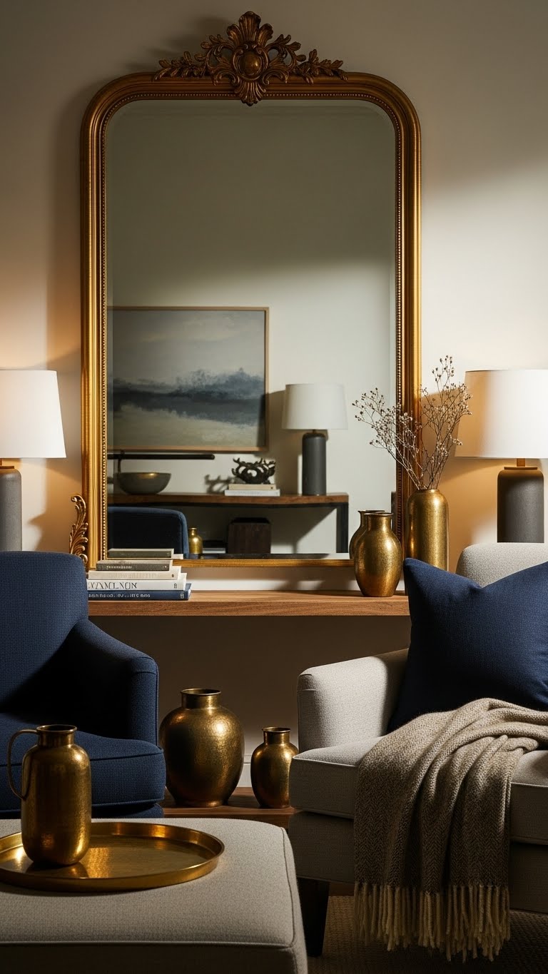 If you’ve grounded a vignette with navy pieces and tactile neutrals, add an oversized gold mirror to lift the whole look and introduce instant glamour. Choose a lightweight frame you can hang solo or lean; the statement mirror amplifies light and scale.
