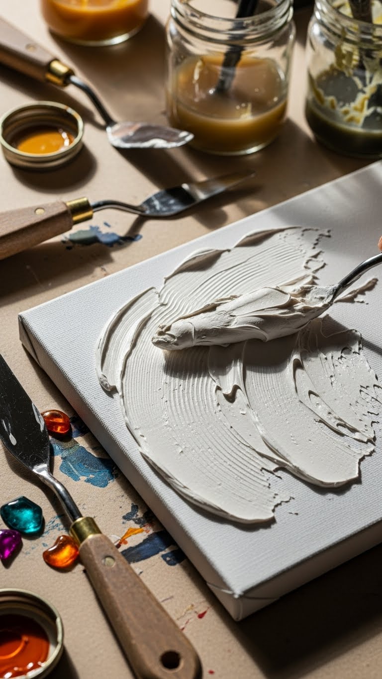 Start by gathering a few basic materials—modeling paste, a palette knife, acrylic paints, a primed board or canvas, and a few tools for texture—so you’re ready to work wet-on-wet.