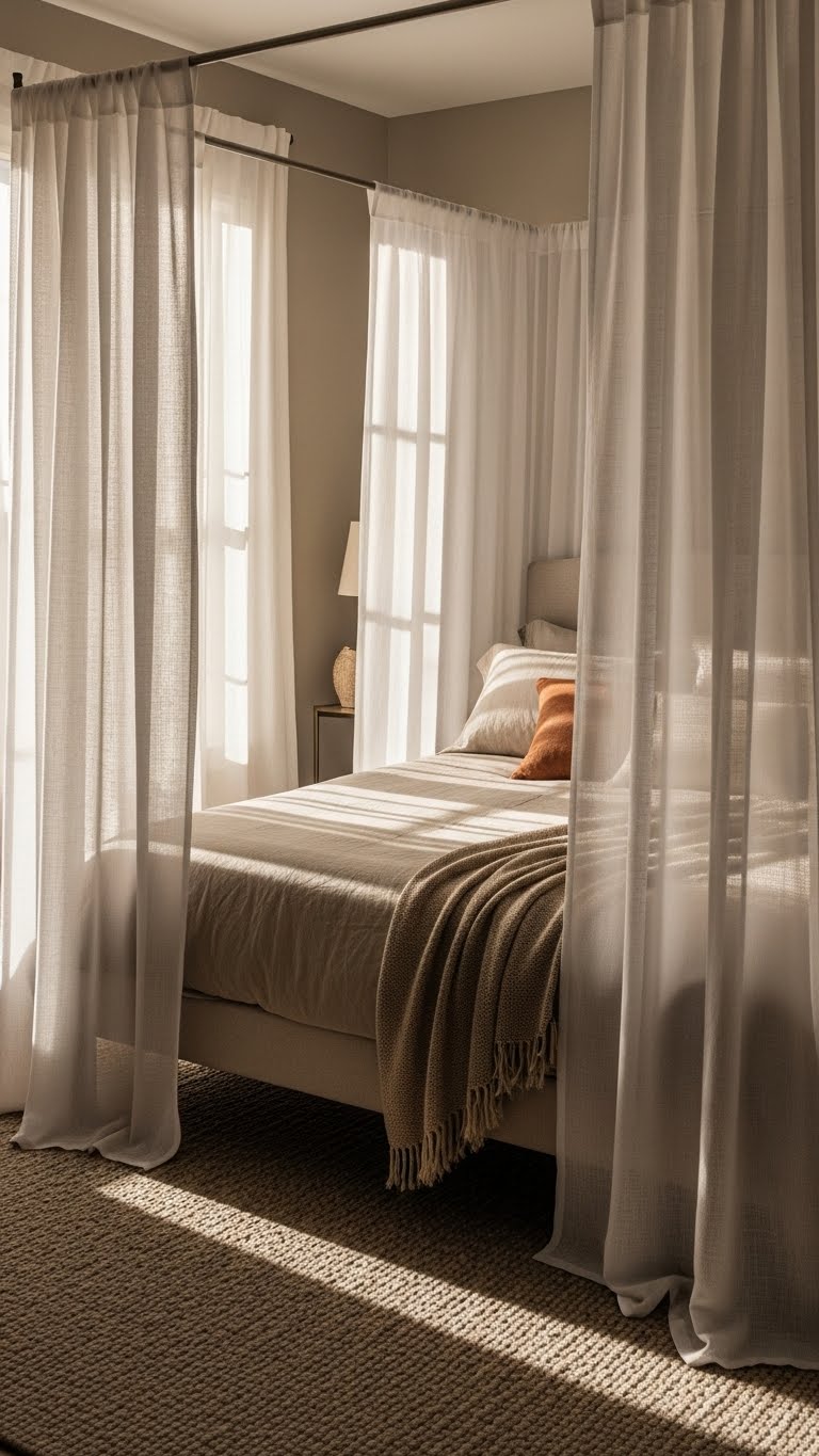 If you’ve toned your floors for a soft, cohesive base, carry that calm upward by wrapping drapery around the bed frame to create an intimate canopy. Choose a sheer drape for airiness, anchor fabric to a simple bed crown, and use hidden hooks for clean lines. Add fabric tiebacks to reveal views or cocoon the bed—effortless, liberated, and luxe on a budget.