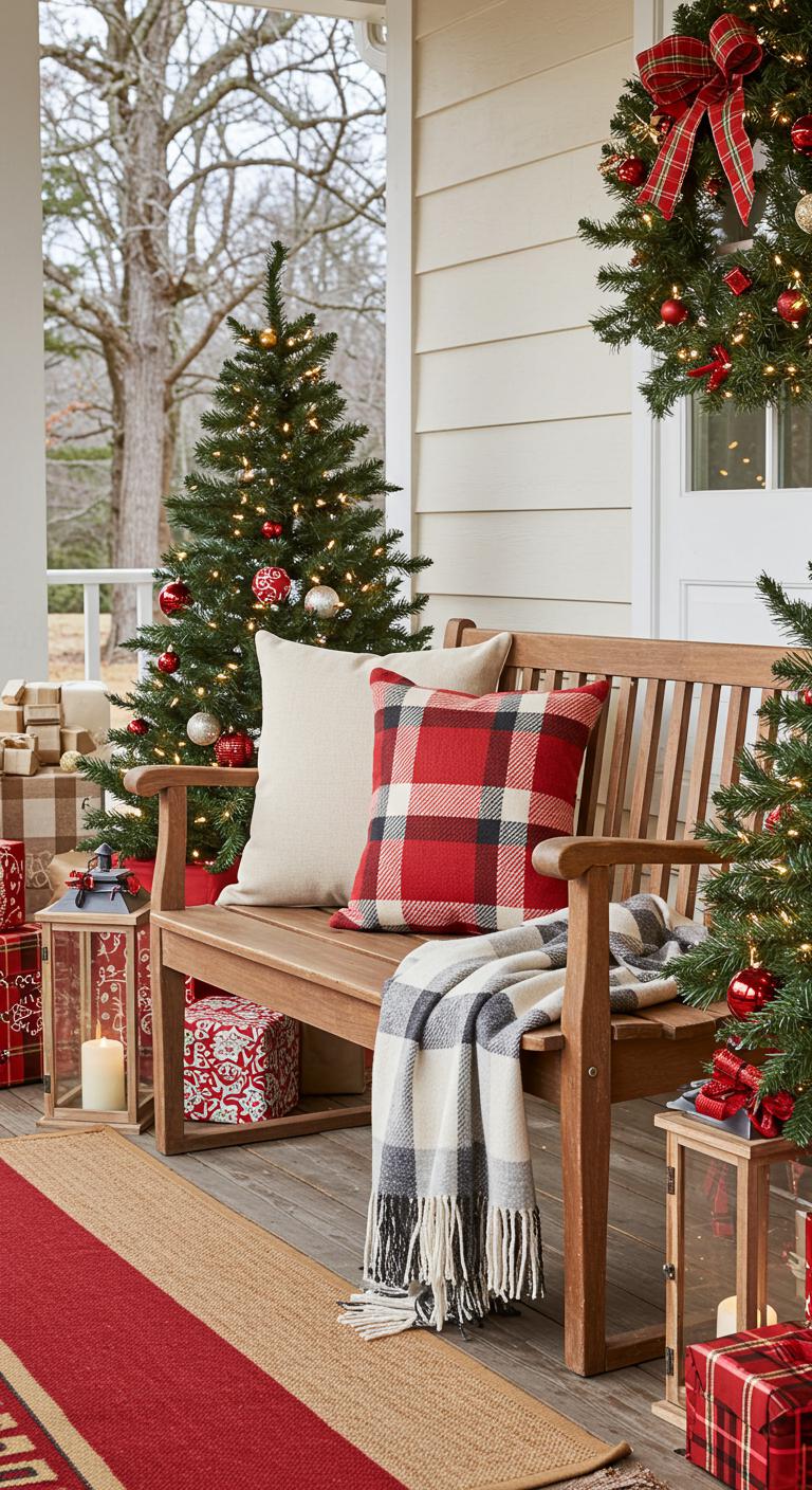 Set a welcoming sleigh bench at your entry and drape a cozy flannel throw over one arm to create instant holiday charm; measure the bench width first so the throw hangs evenly without touching the ground.