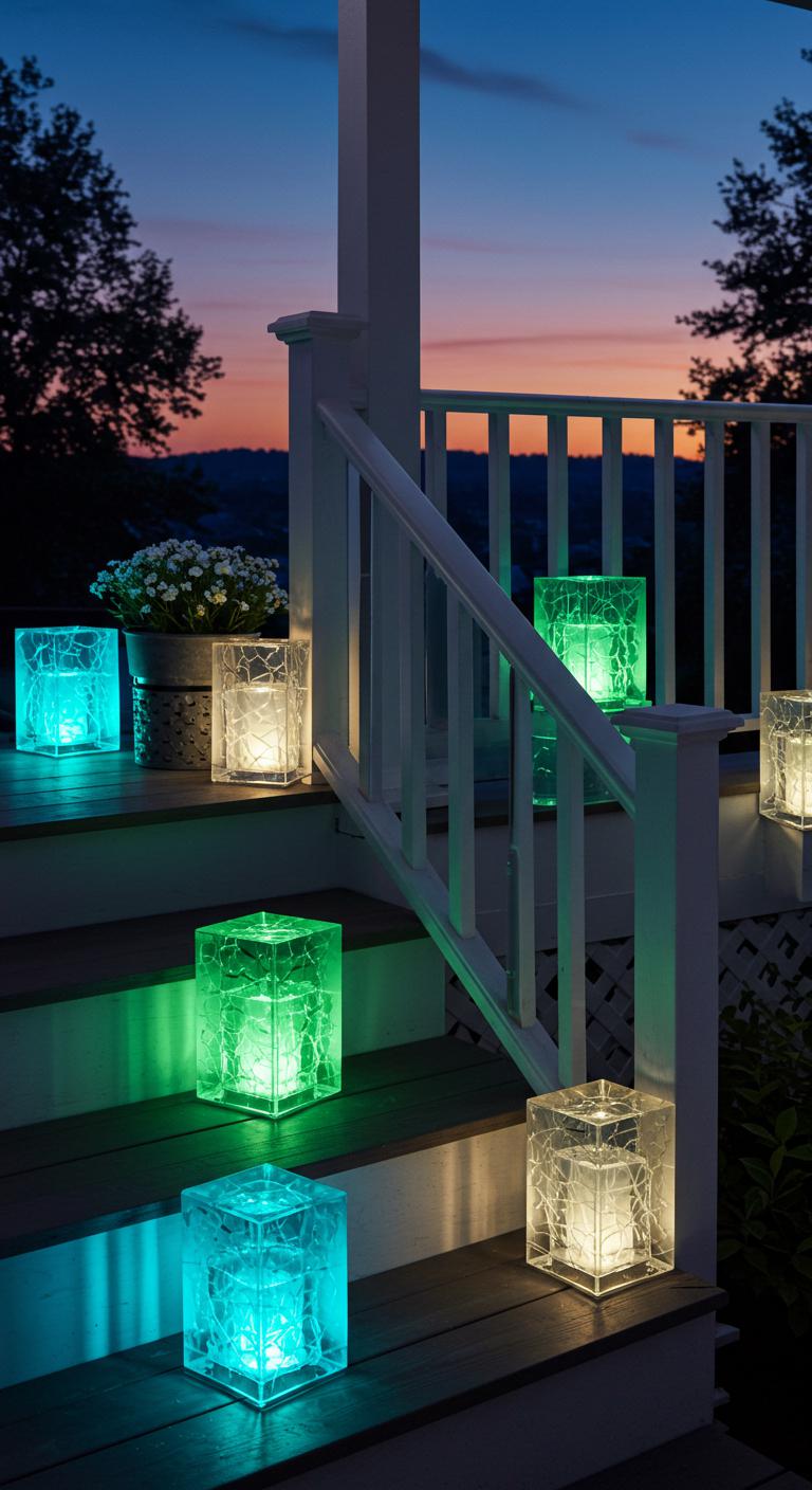 Fill clear molds with water, layer acrylic colors or leave transparent, freeze solid, then nest submersible lights inside. Seal bases, position for even lantern placement along steps or rail, and swap colors for mood.