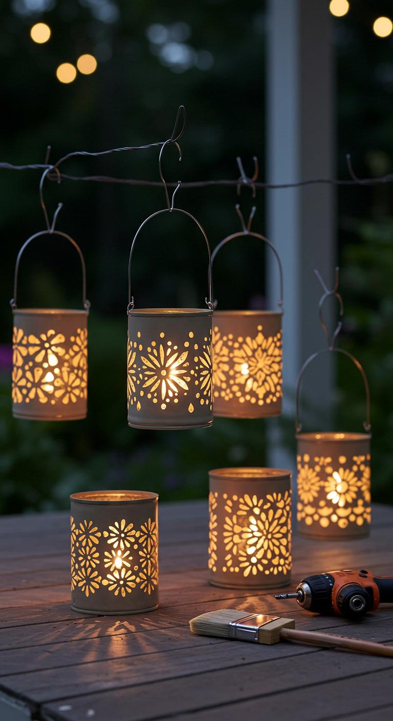 When you cut, punch, and repaint old metal cans, they turn into sturdy, weatherproof candle lanterns that add warm, moving light to porches and pathways.