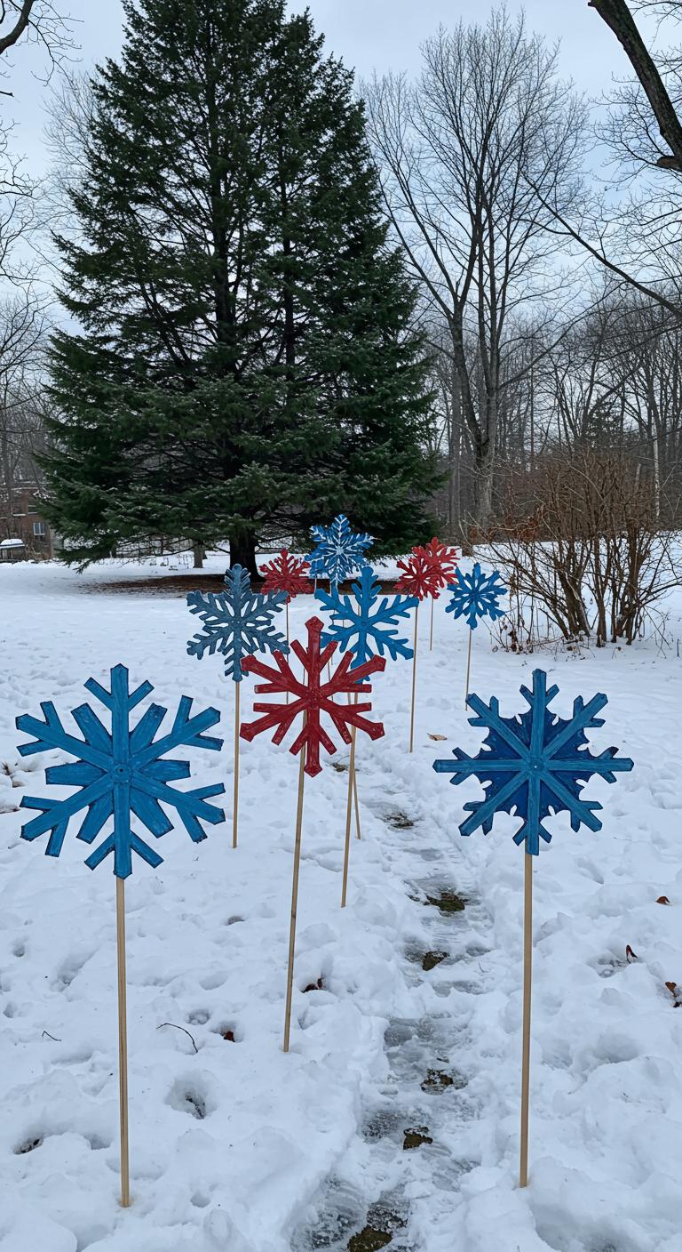 If you want a dramatic, low-cost yard display, make giant snowflake stakes from wooden dowels you can paint and assemble in under an hour.