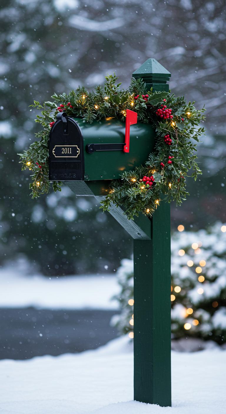 Give your mailbox an instant holiday lift by adding holly accents that are weatherproof and easy to swap out. You’ll strip old bulbs, paint the post matte black or deep green, then attach faux holly sprigs with waterproof zip ties. Add a small wreath or magnetic plaque for mailbox decorations. These festive accents stay tidy, replaceable, and let you customize color and placement freely.