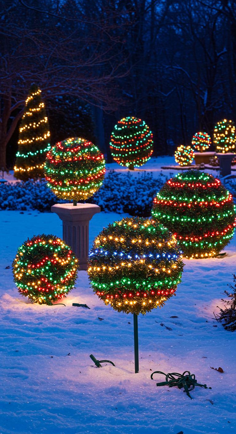 If you want a bright, sculptural accent that’s easy to install, rope light wrapped topiary balls give your yard instant holiday cheer while lasting through cold nights and light snow.