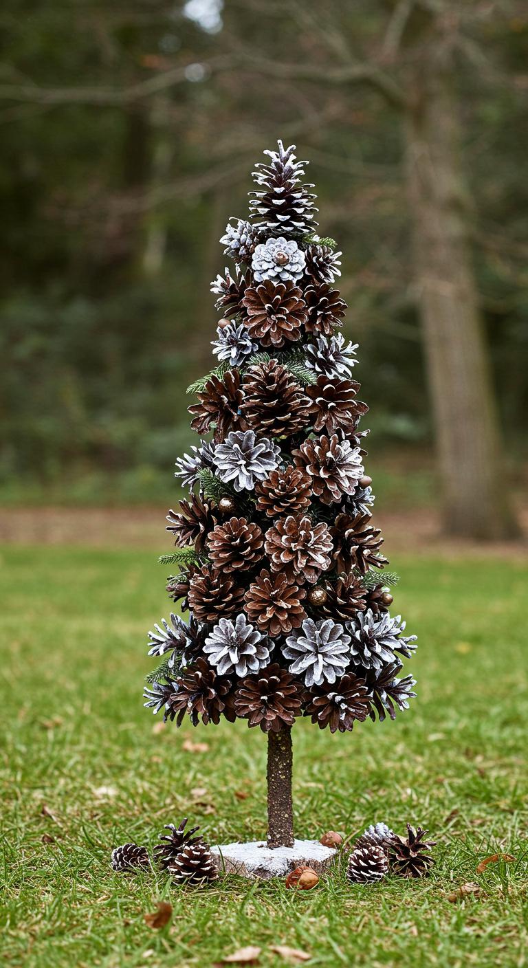 Although they look intricate, standing pinecone trees are simple to build and give your yard rustic height and texture, especially when you accent them with metallic or frosted spray paint.