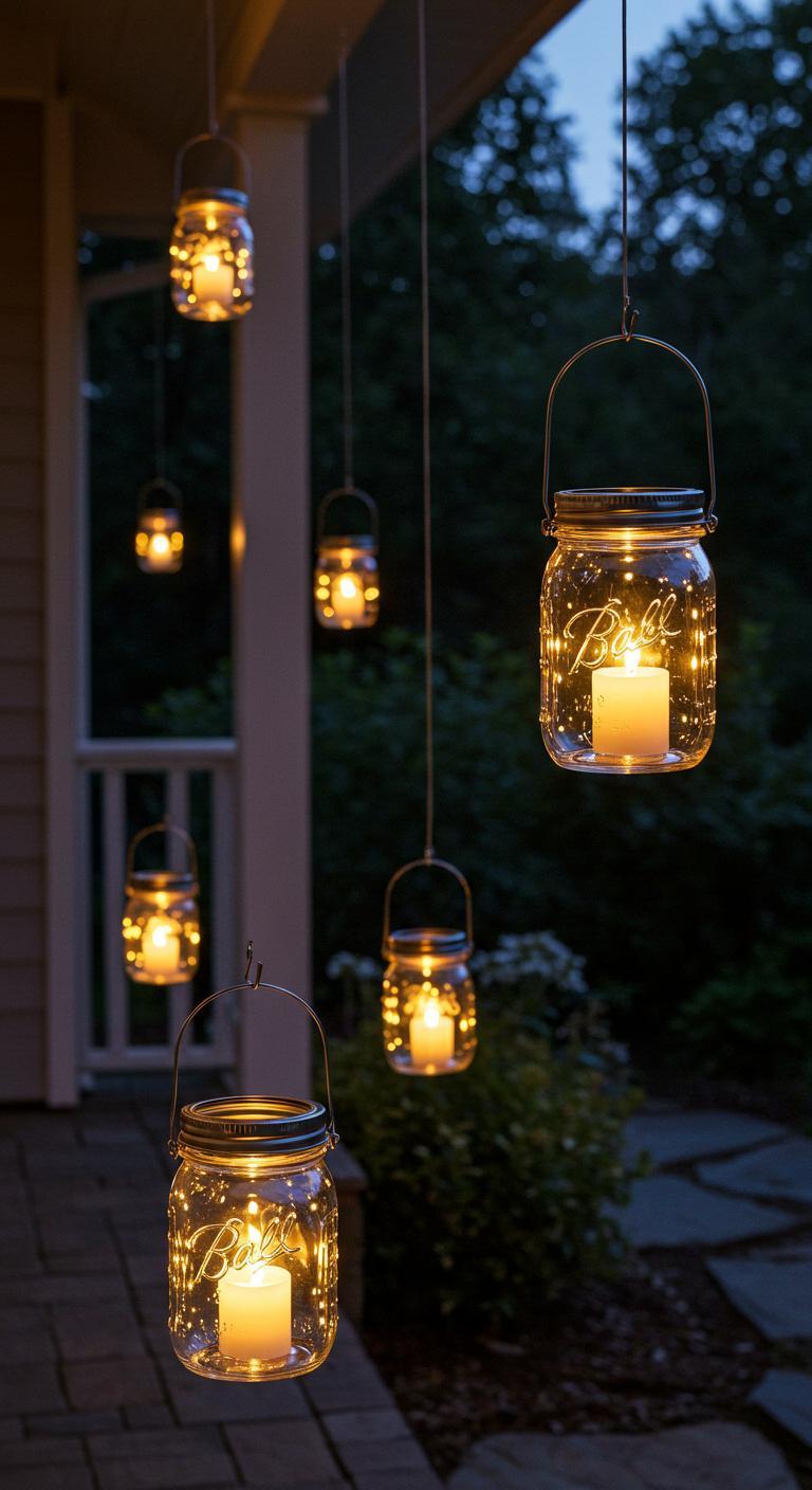 Thread tealights inside, secure lids or wire handles, and anchor jars at intervals.