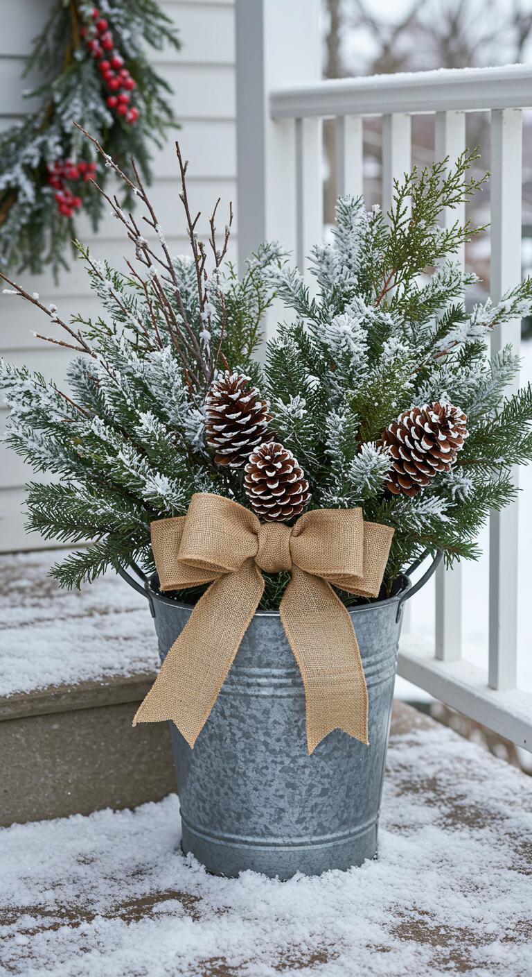 Snow-Dusted Branch Arrangements in Galvanized Tubs