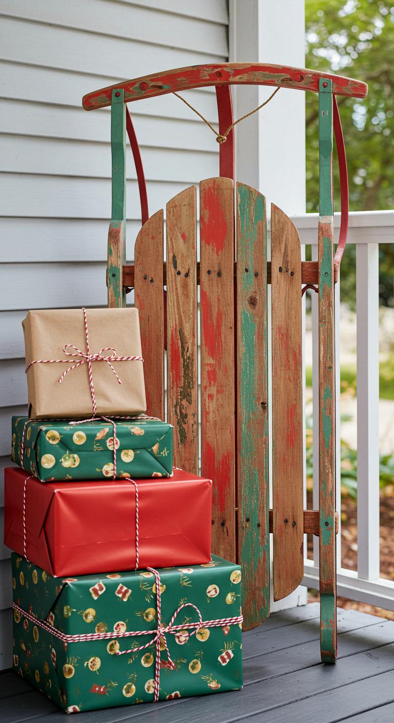 A painted wooden sled makes a striking focal point for your porch when you prop it against a railing or lean it near the door and stack wrapped presents on and around it.