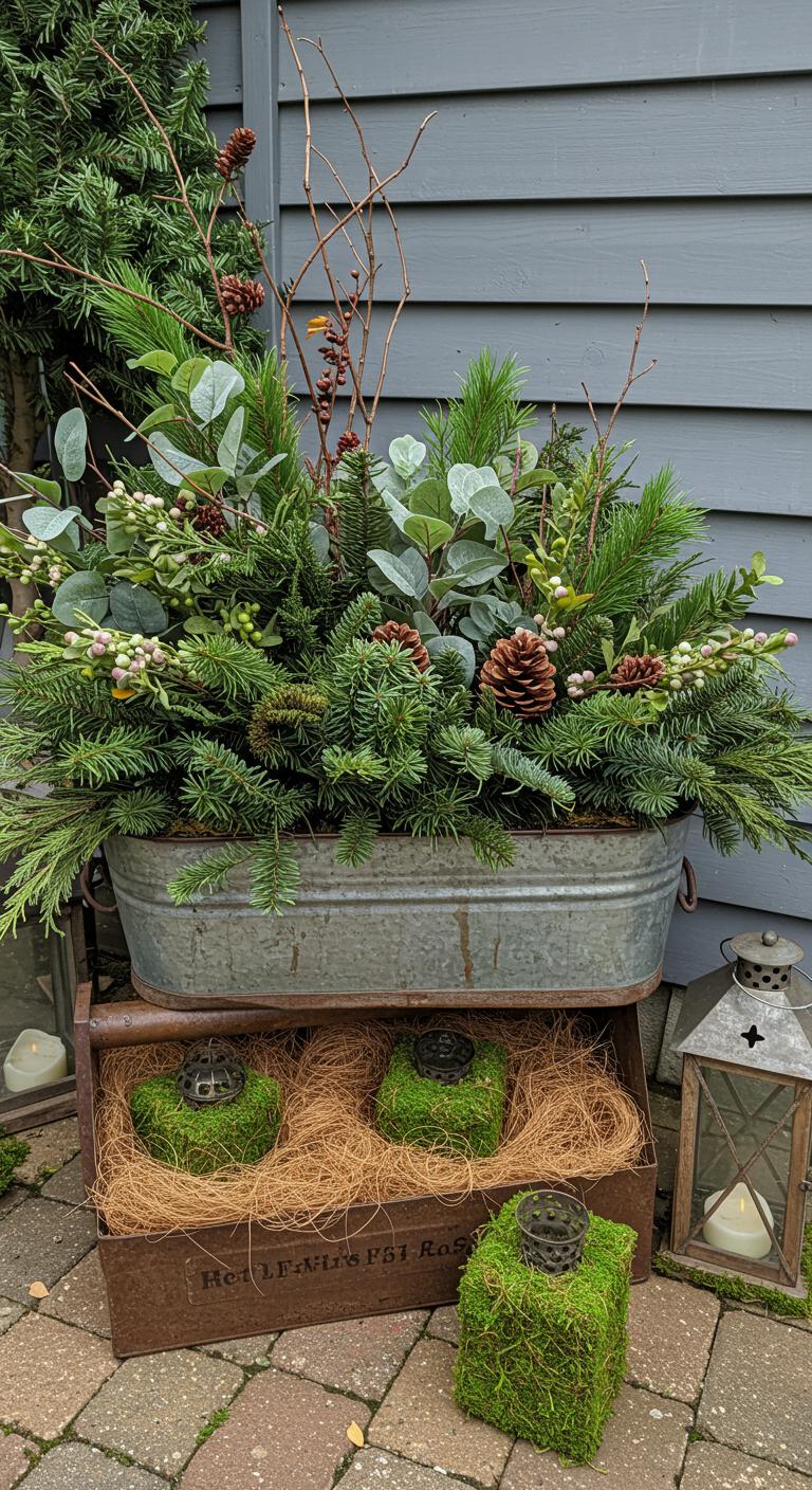 Because galvanized tubs are sturdy and weatherproof, they make perfect vessels for creating snow-dusted branch arrangements that add instant winter charm to porches and walkways.