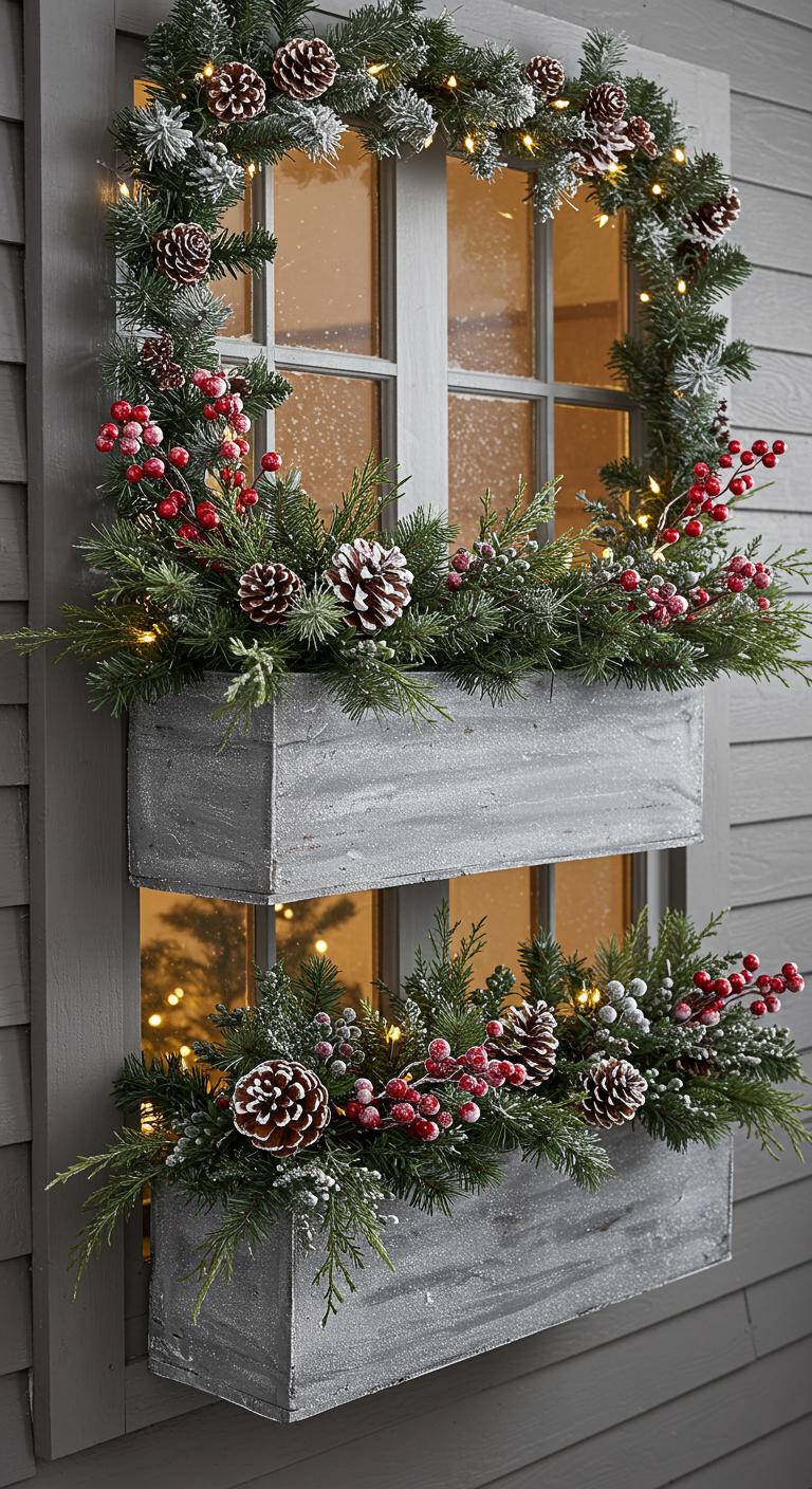 Once your mason jar lanterns are in place, carry that cozy mood to your windows with frosted window boxes filled with pine and berries.