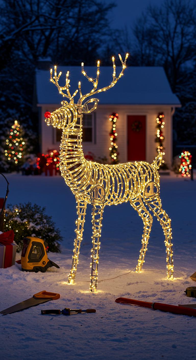 If you want a striking yard focal point that’s lightweight and weatherproof, build a lighted reindeer silhouette from PVC pipe—you’ll cut, glue, and shape simple pipe sections into a graceful outline, wrap them with LED rope lights, and mount the finished piece for easy seasonal display. You’ll follow pvc pipe construction steps, mark curves, dry-fit joints, secure with adhesive, add tie-downs, and enjoy festive lighting ideas that free your creativity.