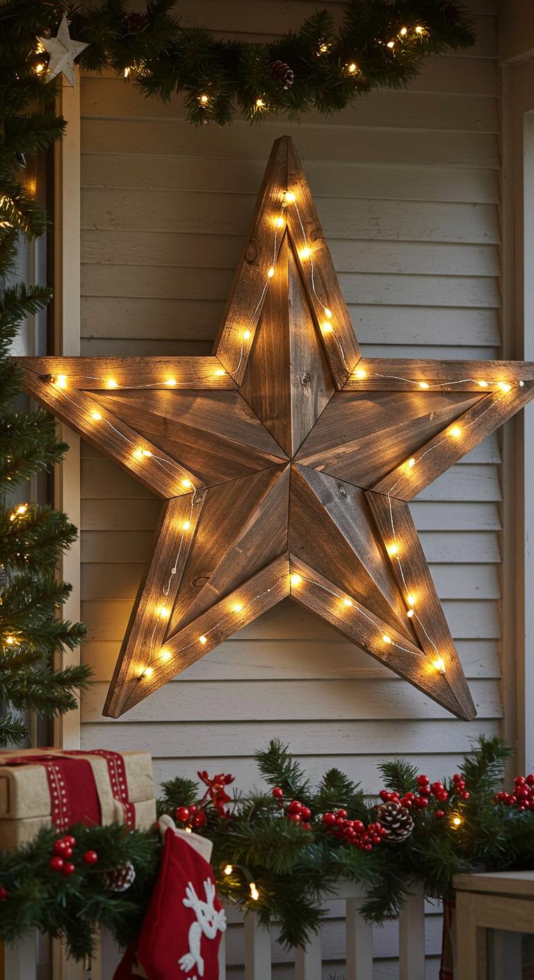 Although this project looks artisan, you’ll build a rustic cedar porch star quickly by cutting and screwing simple boards into a five-point frame, sanding edges for a weathered look, and wrapping the finished star with LED rope lights for soft, even illumination. You’ll stain or seal for lasting rustic charm, mount it securely on your porch, and adjust light spacing to set welcoming holiday ambiance.