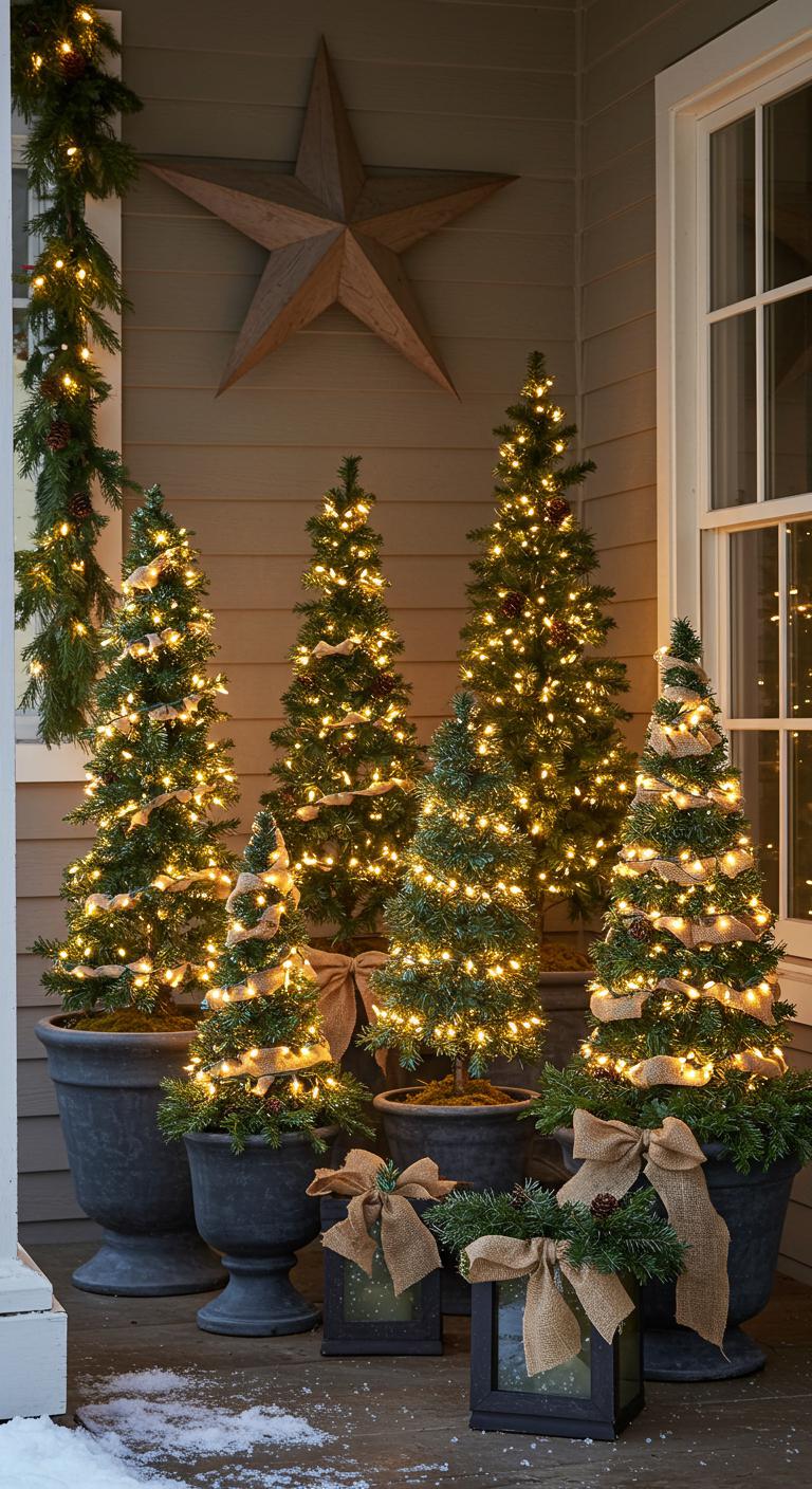Add subtle tree embellishments like ribbon or tiny ornaments for a clean, bold outdoor statement.