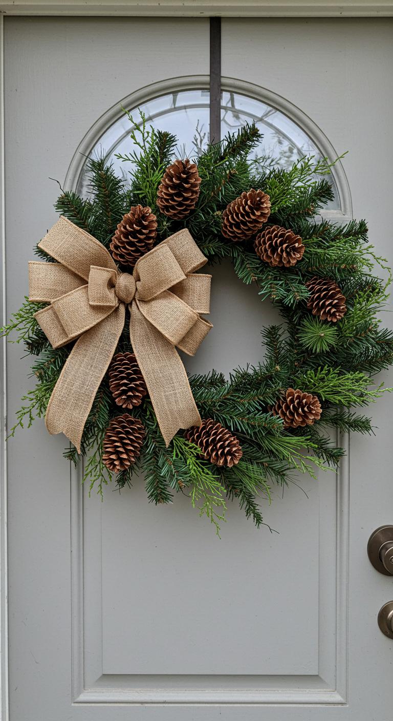 Start by gathering a sturdy wire or grapevine wreath form, fresh or faux evergreen sprigs, a few pinecones, and a wide burlap ribbon — you’ll build the wreath layer by layer so it looks full and balanced. Lay sprigs, secure with floral wire, stagger layers for depth. Use burlap bow techniques for a bold centerpiece, then apply pinecone arrangement tips to anchor natural accents evenly.