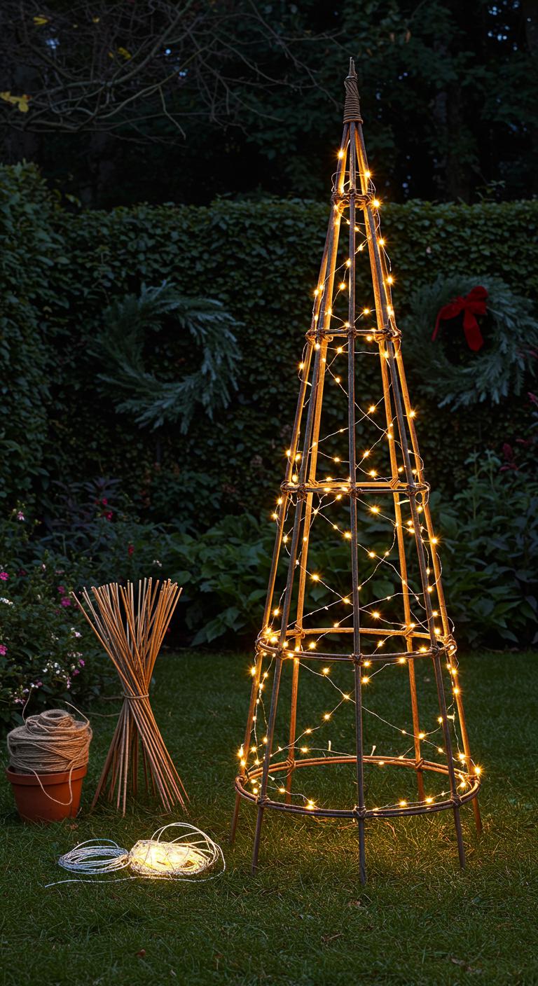 If you enjoyed shaping an evergreen wreath, you’ll like building a lighted obelisk from garden stakes—it gives the same hands-on satisfaction but adds vertical glow to your yard.