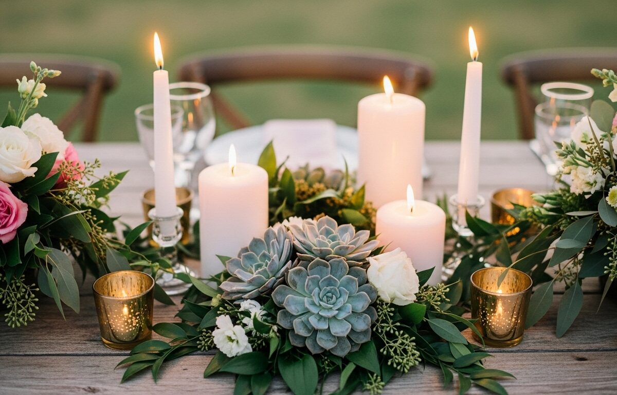 A long table lined with candles and flowers for that formal reception glow – elegant yet doable. My wedding planner friend swears by this layout; she used LED candles for safety. Scale it down for smaller gatherings too.