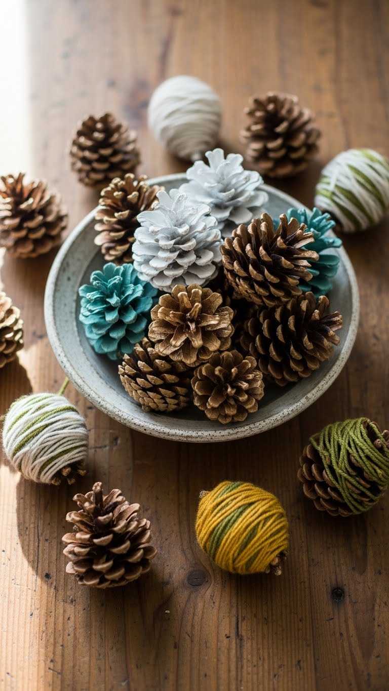 Pick up pine cones from your yard. Paint them white or gold with cheap craft paint. Tie yarn around for a rustic touch. Place them in a bowl on your table. This costs pennies if you forage. Use what you find outside. Arrange with candles for a centerpiece. It’s quick and easy for beginners. No fancy supplies required. Just paint and string. Set up in under 10 minutes. These add a natural feel to any room. Mix colors for your style. They work for holidays or everyday. Keep them simple to avoid mess. Dust them off and reuse next year. Share with friends as small gifts. Turn nature into decor effortlessly. Watch your table come alive.